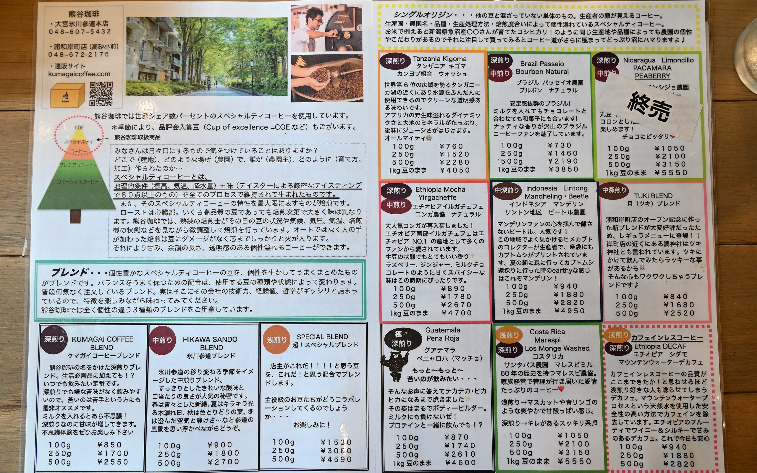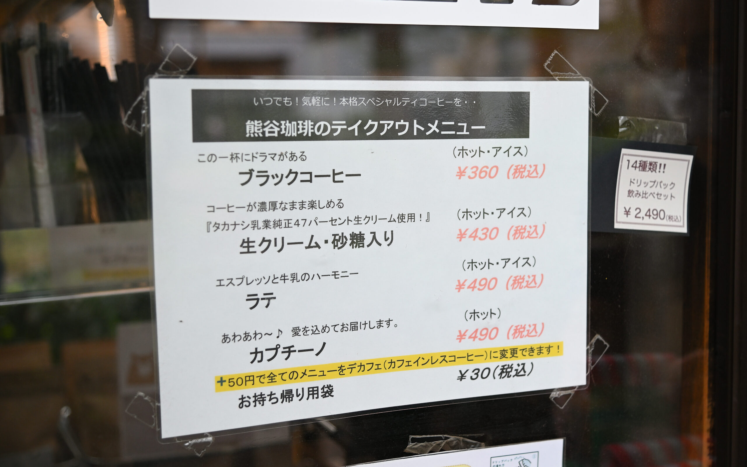 テイクアウトコーヒーは360円〜。豆は、例えば、人気のエチオピア イルガチェフェ コンガ農協ナチュラルは100g890円、250g1,780円、500g2,670円、1kg4,700円となっている。100gでも良心的なのに、まとめ買いをすると割引率が高くなるのも魅力的なポイントだ。1kgの場合、100gあたりなんと470円である(2026年4月22日時点)。豆の種類により異なるものの、これならスペシャルティコーヒーを気兼ねなく楽しむことができる。これは「おいしいコーヒーを気軽に毎日楽しんでほしいです」と語る、オーナーである熊谷さんの心意気なのだろう。